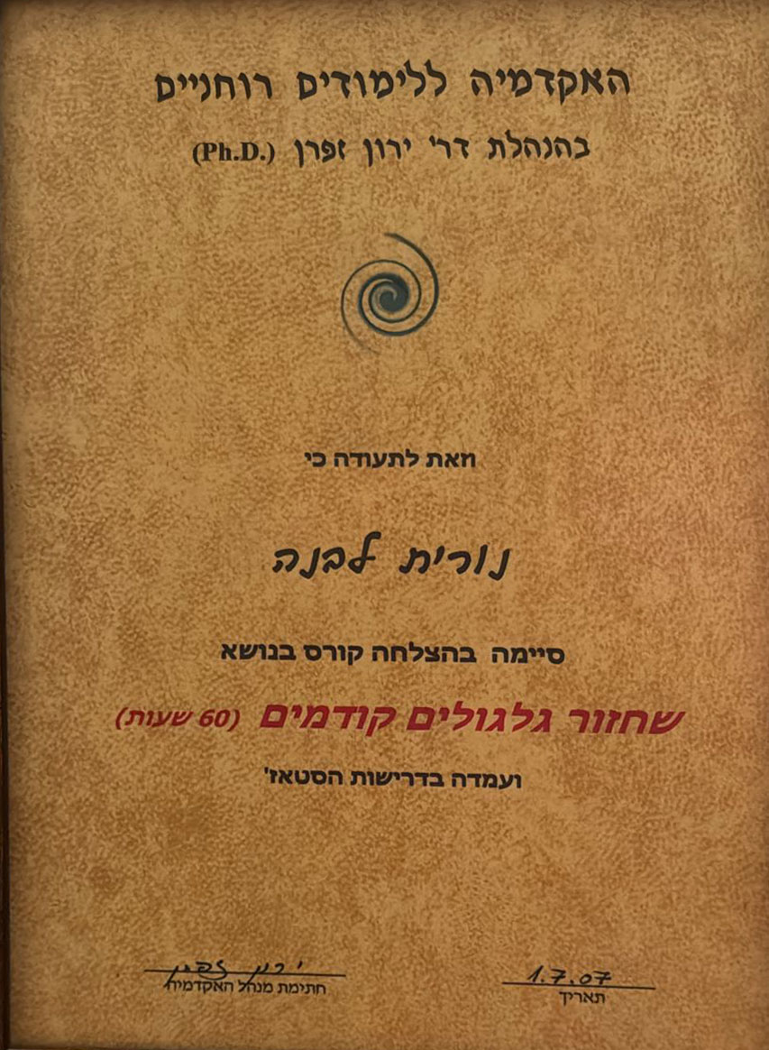 במהלך השנים למדתי והתמחיתי בדמיון מודרך, קואצ’ינג, NLP, נומרולוגיה יישומית, שחזור גלגולים, תקשור ואי צ’ינג, מתוך רצון להבין לעומק את החיבור בין הגוף לנפש וכיצד ניתן לסייע לאנשים להתגבר על קשיים רגשיים ופיזיים.